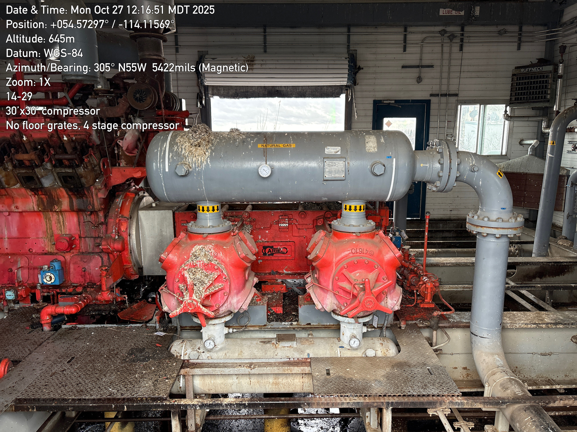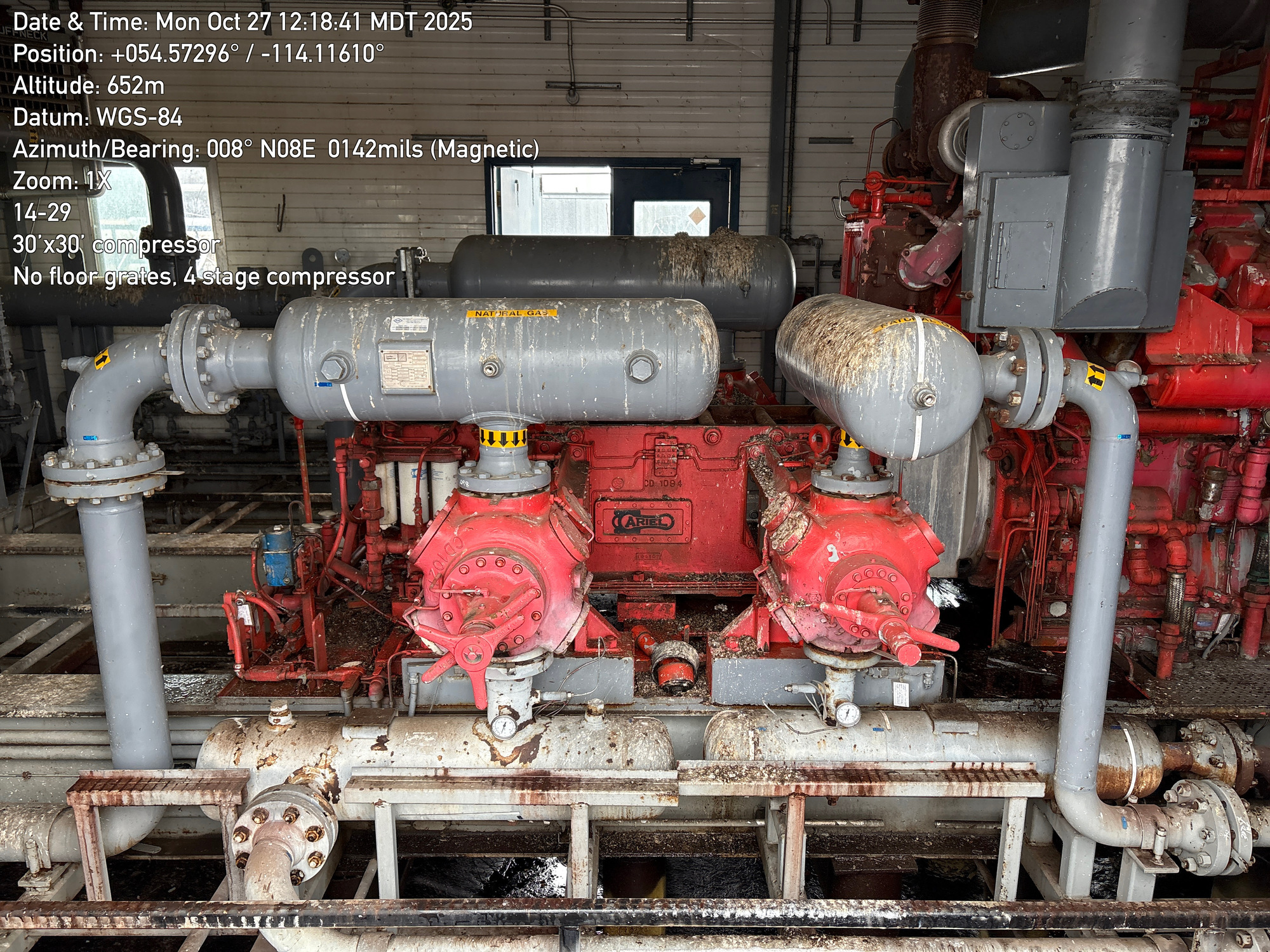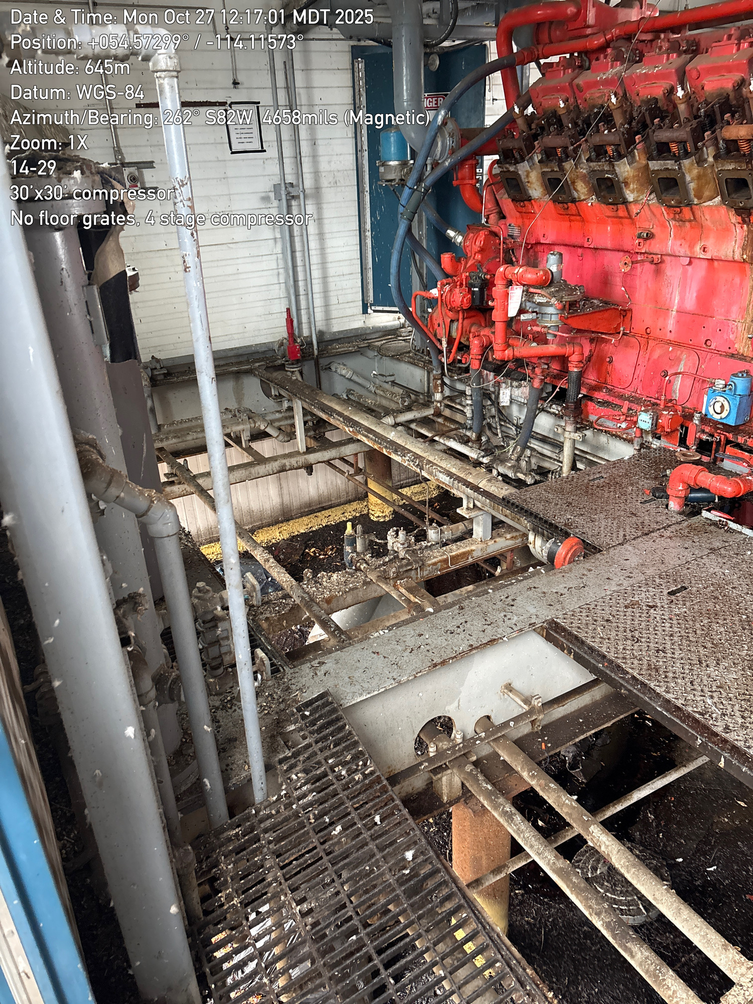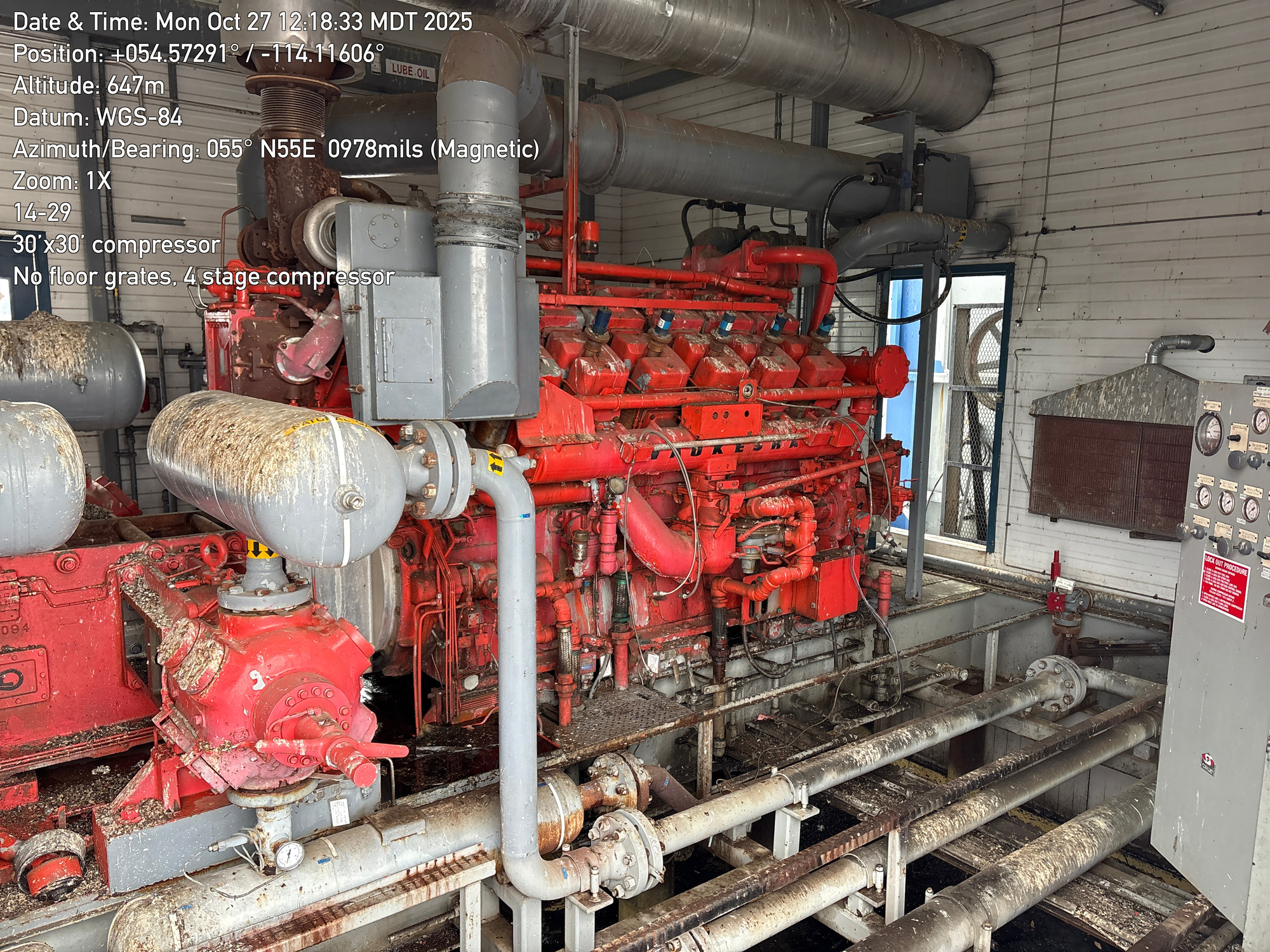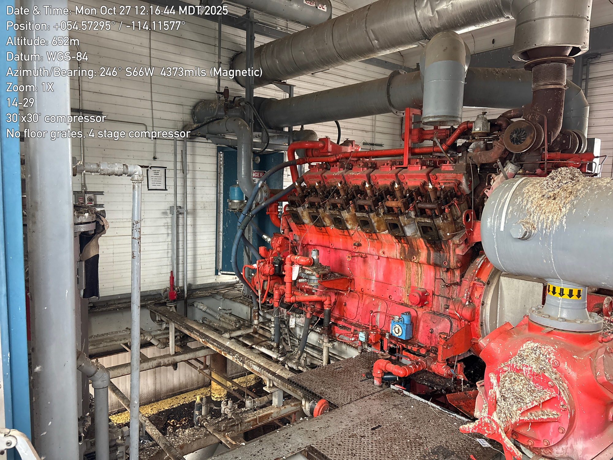 4 stage compressor with a 12 cylinder engine, inside a 30'x30 building with 2-ton crane located at 14-29-064-01W5 (FA). Lots of bird droppings.