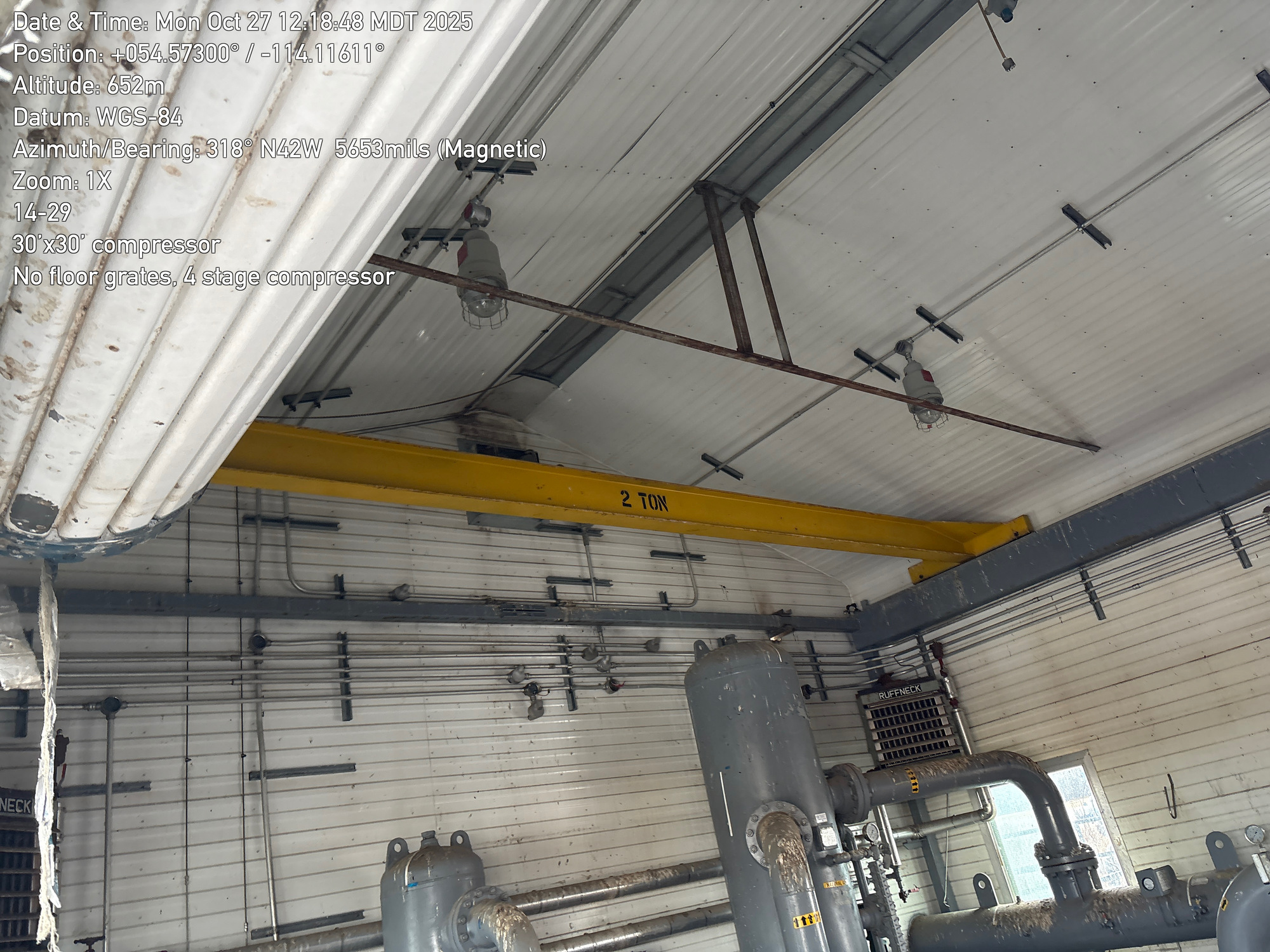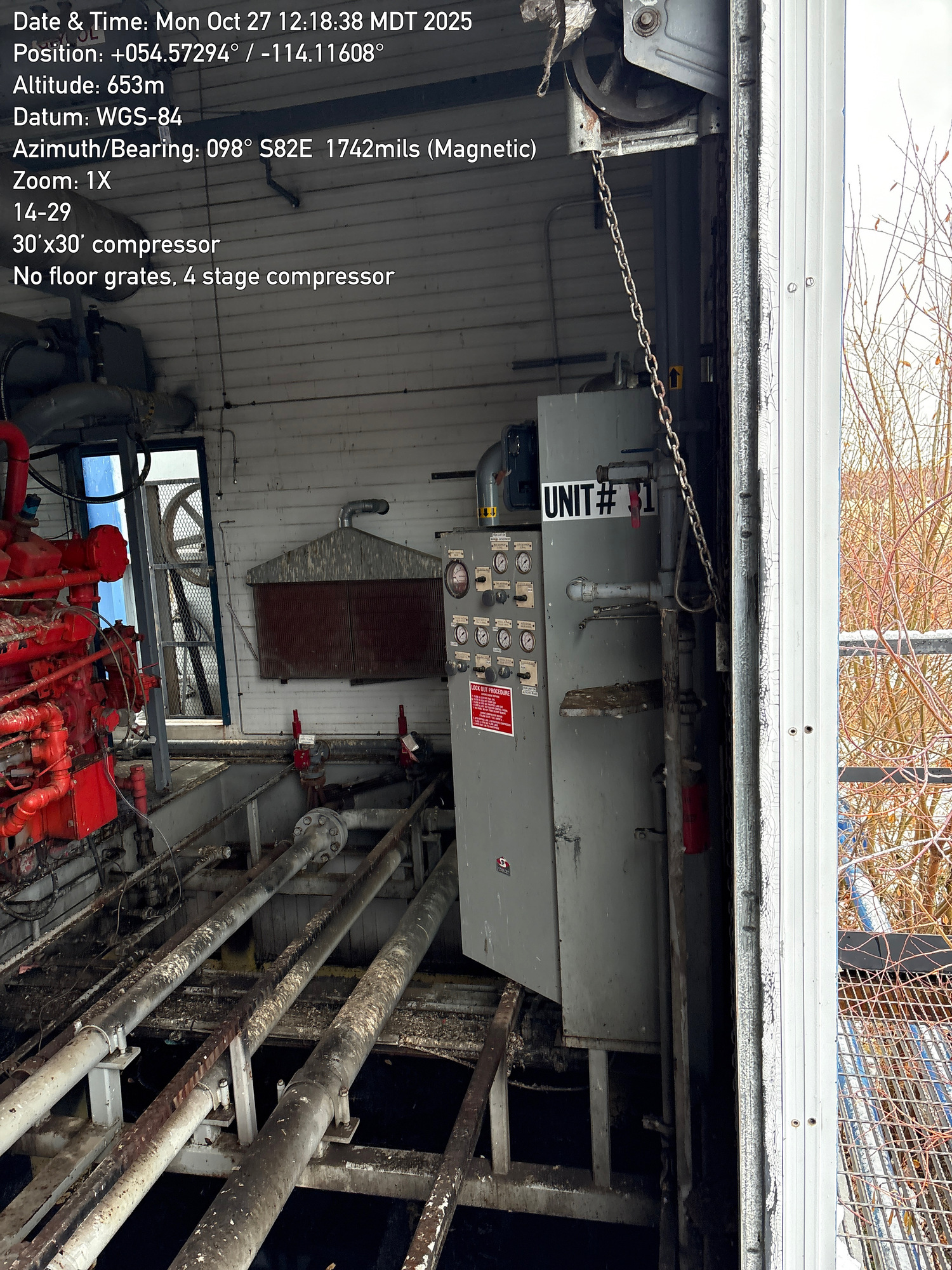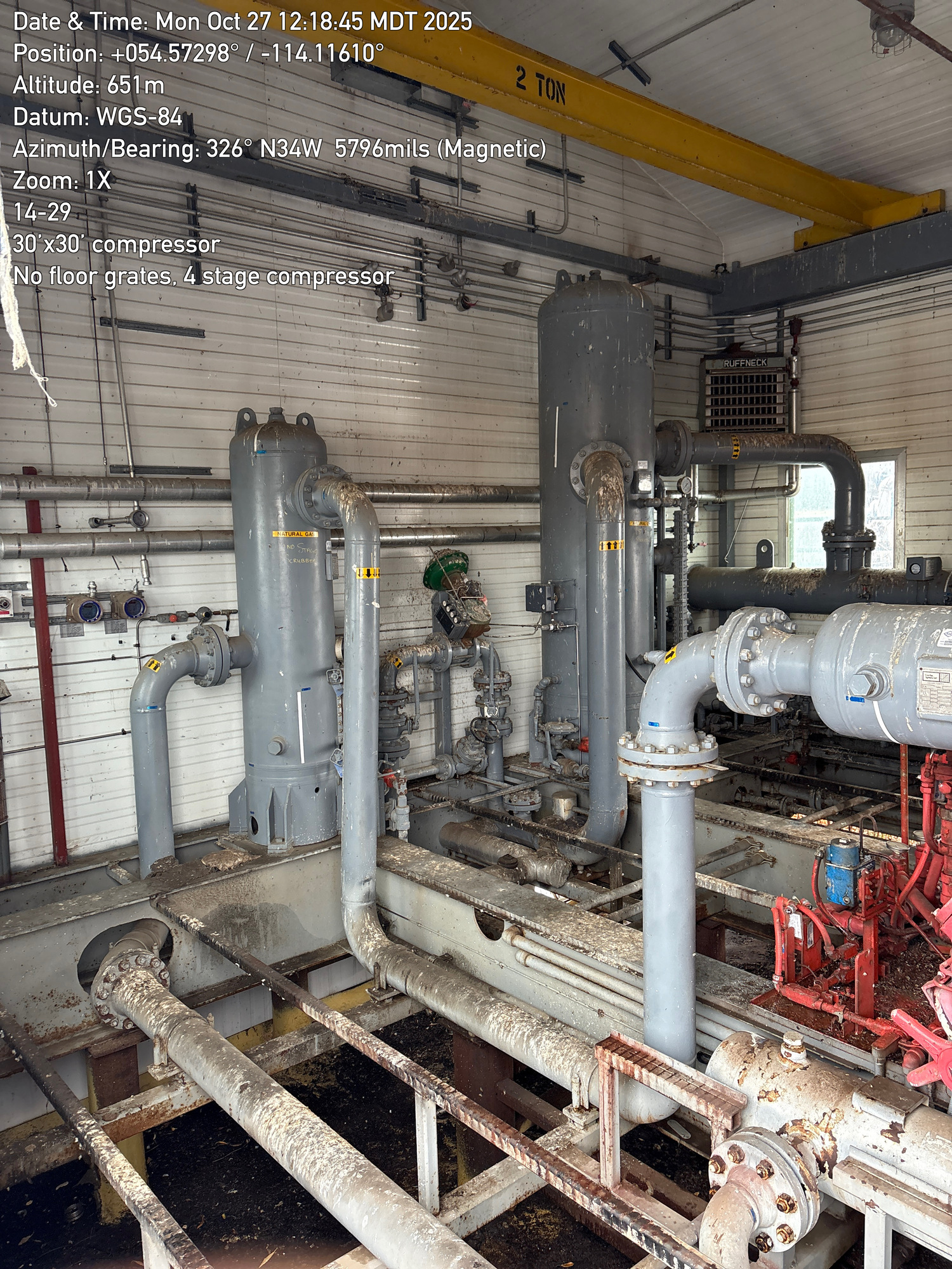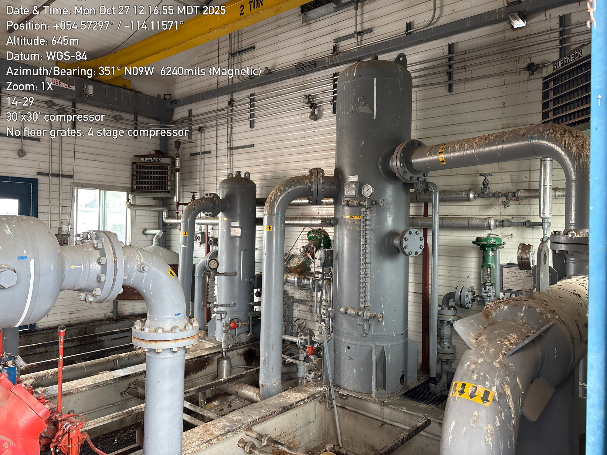 4 stage compressor with a 12 cylinder engine, inside a 30'x30 building with 2-ton crane located at 14-29-064-01W5 (FA). Lots of bird droppings.