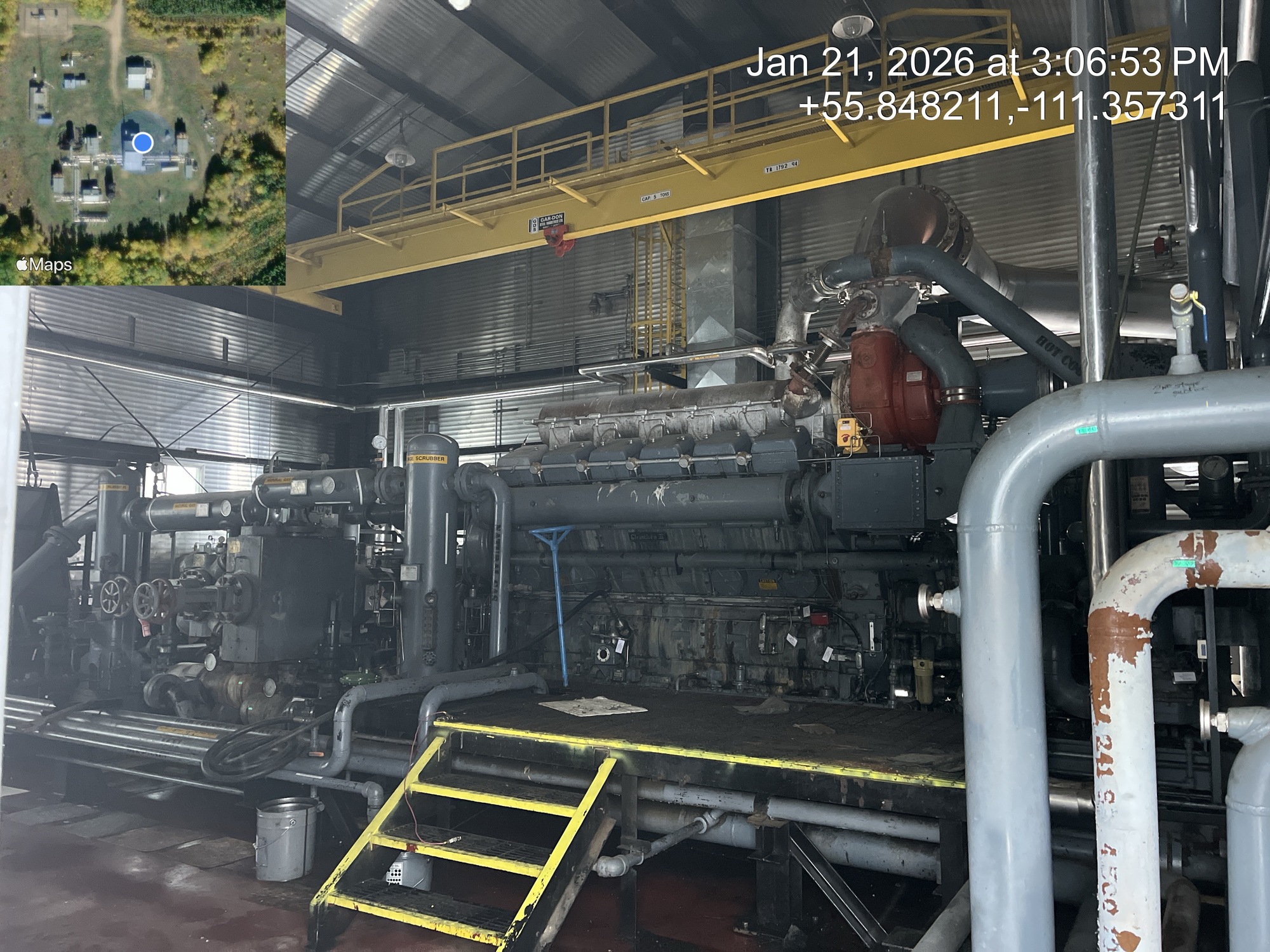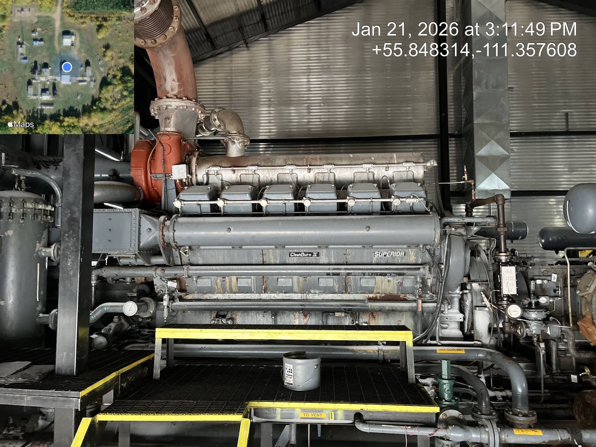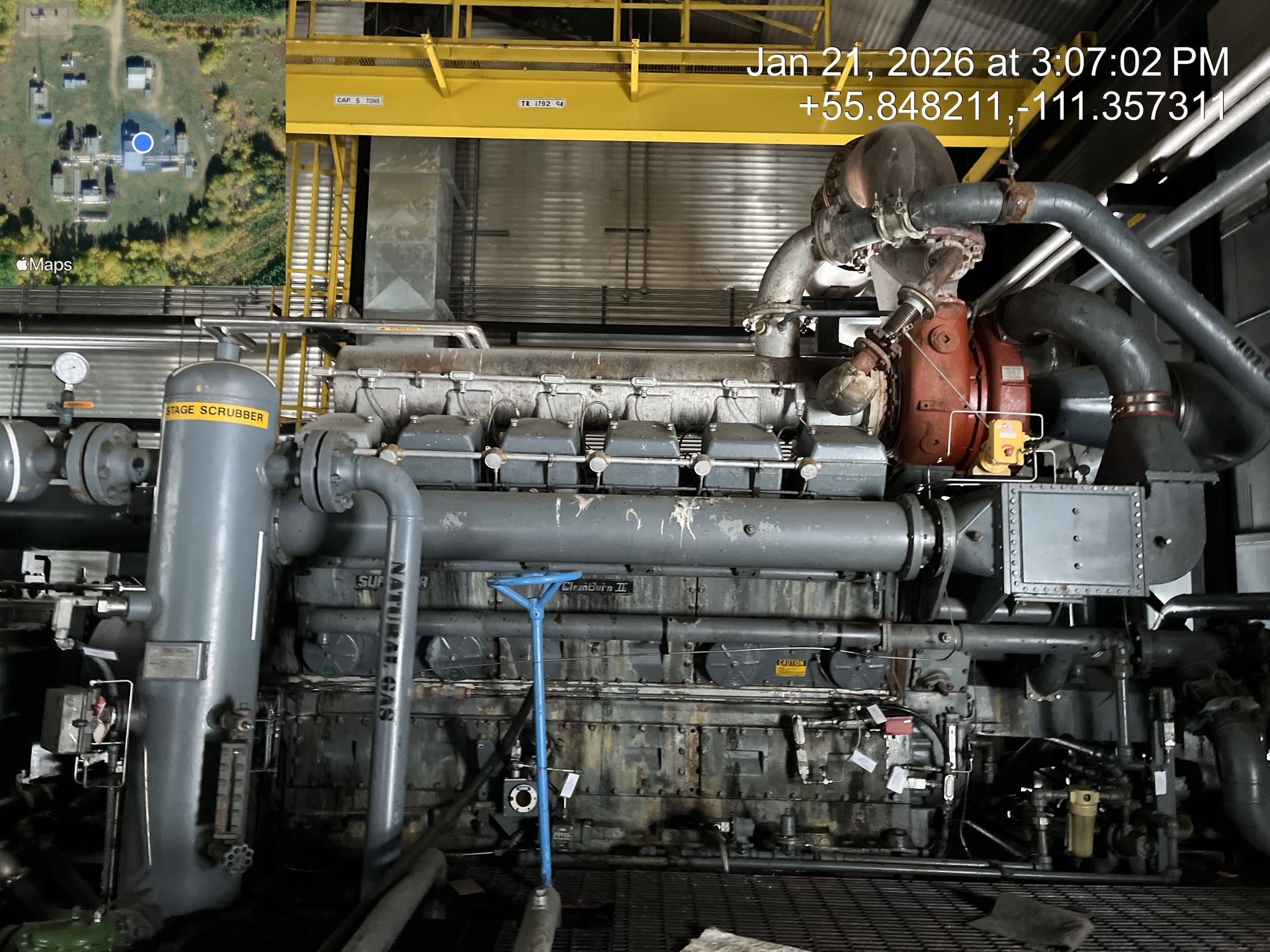 4 stage compressor (ID plate illegible) with a 2000 HP Superior CleanBurn II V12 gas engine inside of a 66.5’x50’ building with a 5 ton crane, located at 12-16-079-09W4 (Facility)