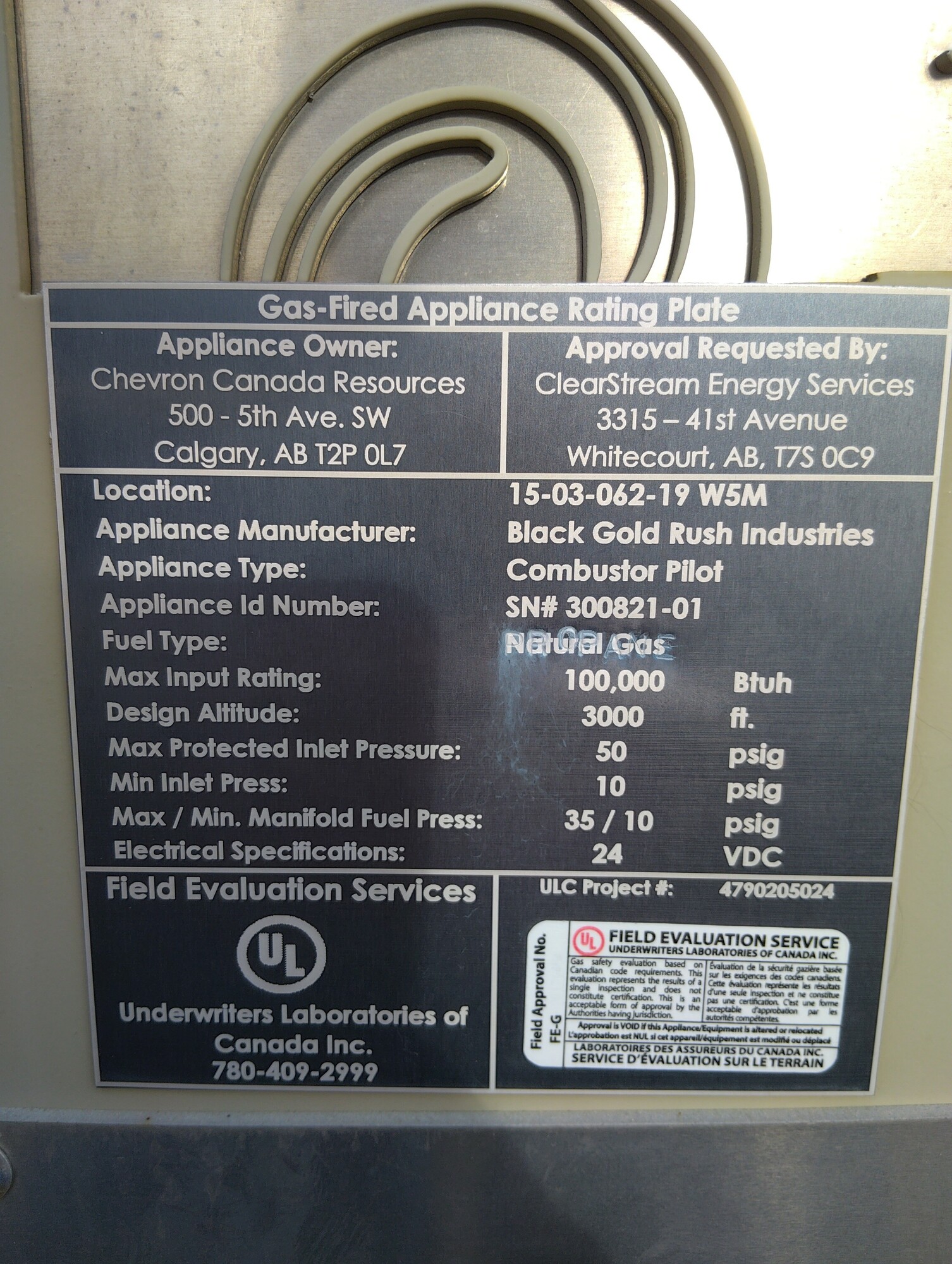 Combustor, 100000 BTU/Hr, Black Gold Industries Combustor Pilot, 50psig Max Inlet Pressure, 24VDC, MODEL BGR-CUBE 10000
