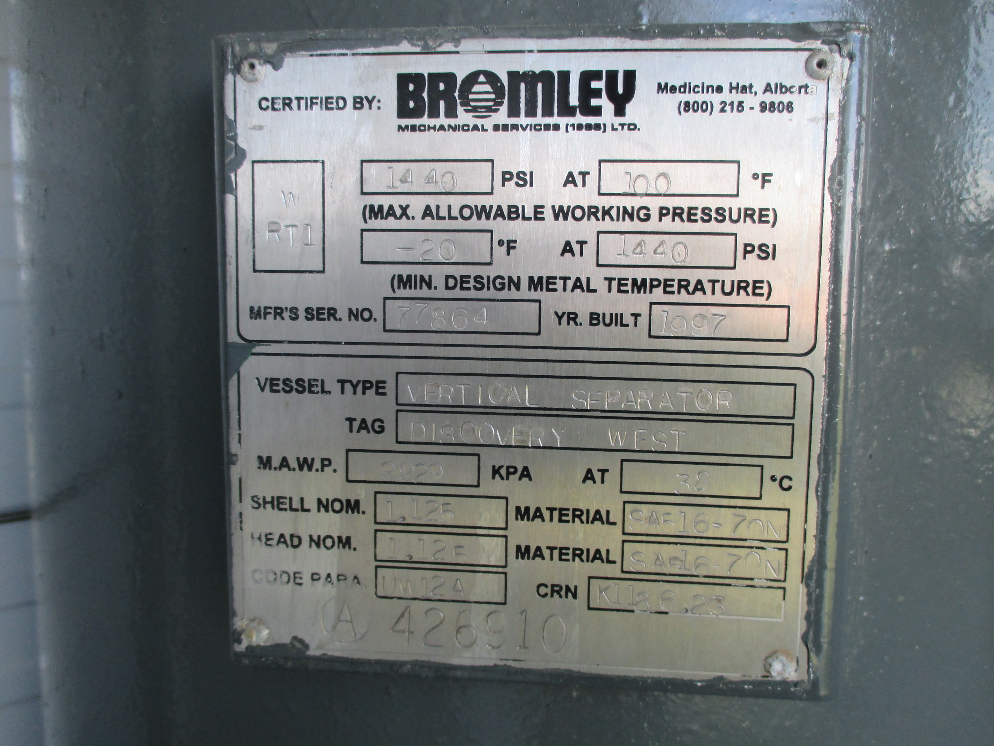 Reconditioned Bromley 24” x 7’6” 1440 PSI 3 Phase (dressed 2) Separator Package