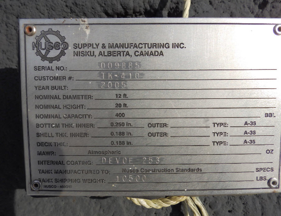 Summary Description : 400 BBL, Single Wall, Insulated, Internally Coated, Skidded Tank